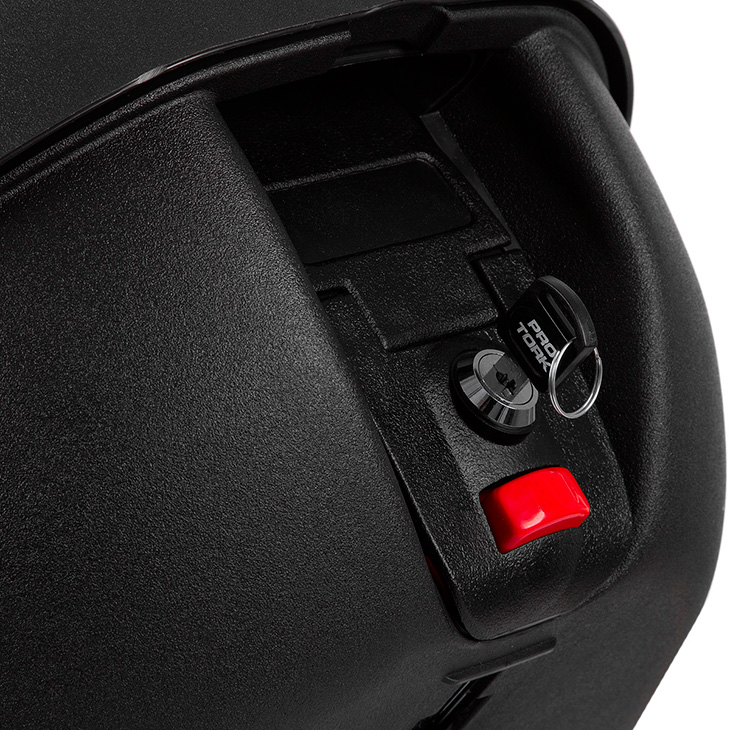 Dispõe de capacidade de 28 litros, fechadura completa para aumentar a segurança e lente com refletor.